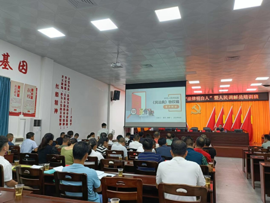 活动中,由广东德良(阳江)律师事务所郭尤律师向参会人员着重讲解《中华人民共和国民法典》中的物权编,结合实际案例生动形象地讲解法律规定,让参会人员对法律知识有进一步的了解,为推动河㙟镇法治建设贡献力量。河㙟司法所所长庄立同志则从人民调解员的职责出发,深入浅出地讲解了纠纷调解技巧,并通过解析相关实例,分享成功调解的经验,促进了人民调解员调解能力的提升。